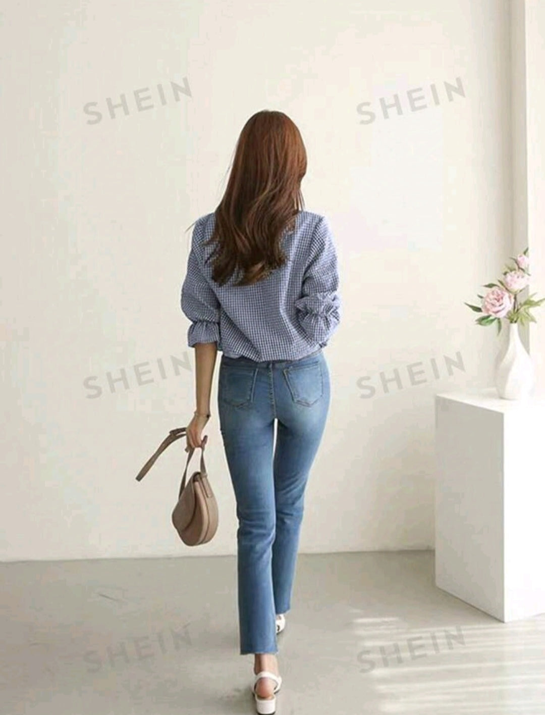 Añade un toque de dulzura a tu guardarropa de verano con nuestra Camisa Casual de Verano con Cuello Redondo y Patrón a Cuadros. Los detalles de volante y las mangas de campana crean un estilo casual y elegante. Hecha con un tejido elástico ligero, esta camisa asegura comodidad durante todo el día. ¡Disponible en blanco y negro, estampado de guingán y cuadros!